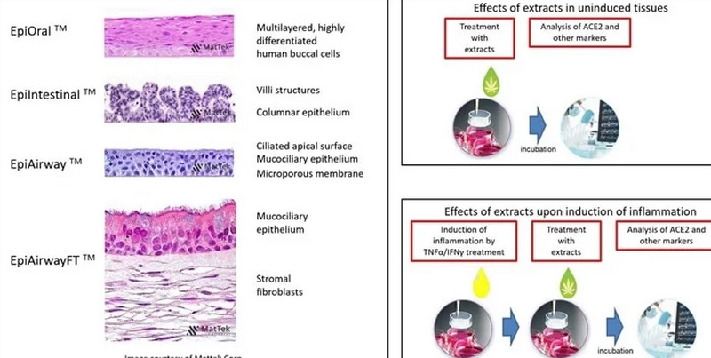 Χρησιμοποιώντας τεχνητά 3D ανθρώπινα μοντέλα στοματικών ιστών, ιστών αεραγωγών και εντερικών ιστών, οι ερευνητές εντόπισαν 13 εκχυλίσματα C. sativa υψηλής περιεκτικότητας σε CBD που μείωσαν σημαντικά προς τα κάτω την έκφραση του ACE2.