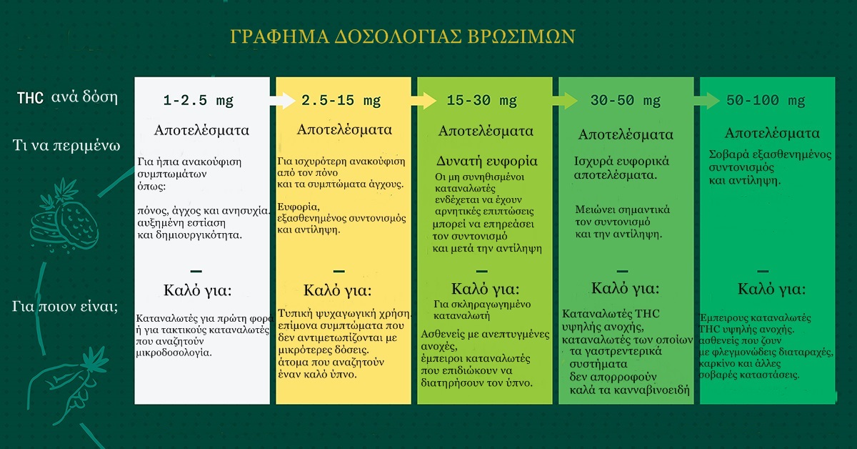 Μπορεί κάποιος με μία χρόνια κατάσταση να χρειάζεται πιο δυνατό έλαιο (δηλ. με μεγαλύτερη συγκέντρωση / περιεκτικότητα) – ας πούμε για την πολλαπλή σκλήρυνση ή για την ψωρίαση. Ενώ κάποιος που το χρησιμοποιεί μόνο για καλύτερο ύπνο μπορεί να τον βοηθήσει ένα έλαιο με μια μικρότερη συγκέντρωση. Αν δέν έχεις κάποιον να σε καθοδηγήσει για τη δοσολογία, το σίγουρο είναι ότι πρέπει να ξεκινήσεις με μία δόση πολύ μικρής ποσότητας, και να ανέβεις σιγά σιγά από κει – παρατηρώντας τις αντιδράσεις του οργανισμού- π.χ. μία σταγόνα. Ανεβάζοντας έτσι αργά και σταθερά με παρατήρηση είναι ο μόνος τρόπος για να μην προσπεράσουμε το δικό μας “θεραπευτικό παράθυρο”, δηλ. την δοσολογία που λειτουργεί για εμάς.
