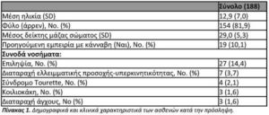 Πληθυσμός ασθενών.Κατά τη διάρκεια της περιόδου μελέτης, 188 ασθενείς με ΔΦΑ άρχισαν την θεραπεία. Η διάγνωση της ΔΦΑ έγινε σύμφωνα με την αποδεκτή πρακτική στο Ισραήλ. Έξι επικεφαλής παιδίατροι ψυχίατροι και νευρολόγοι ήταν υπεύθυνοι για τη θεραπεία 125 ασθενών (80,6), ενώ τα υπόλοιπα 30 παιδιά αναφέρθηκαν από άλλους 22 γιατρούς. Στον Πίνακα 1 παρουσιάζονται τα δημογραφικά χαρακτηριστικά του πληθυσμού των ασθενών. Η μέση ηλικία ήταν 12,9 ± 7,0 έτη, με 14 (7,4%) ασθενείς ηλικίας κάτω των 5 ετών, 70 ασθενείς (37,2%) μεταξύ 6 έως 10 ετών και 72 (38,2%) ηλικίας 11 έως 18 ετών. Οι περισσότεροι από τους ασθενείς ήταν άρρενες (81,9%). Είκοσι επτά ασθενείς (14,4%) υπέφεραν από επιληψία και 7 ασθενείς (3,7%) από Διαταραχή Ελλειμματικής Προσοχής-Υπερκινητικότητας (ΔΕΠ-Υ).