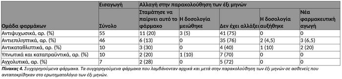 Χρήση φαρμάκων. Τα πιο συχνά συνυπάρχοντα χρόνια φάρμακα στην πρόσληψη ήταν τα αντιψυχωσικά (56,9%), τα αντιεπιληπτικά (26,0%), τα υπνωτικά και τα ηρεμιστικά (14,9%) και τα αντικαταθλιπτικά (10,6%). Από τους 93 ασθενείς που απάντησαν στο ερωτηματολόγιο παρακολούθησης, 67 ανέφεραν τη χρήση χρόνιων φαρμάκων κατά την πρόσληψη. Συνολικά, έξι ασθενείς (8,9%) ανέφεραν αύξηση της κατανάλωσης φαρμάκων, σε 38 ασθενείς (56,7%) η κατανάλωση φαρμάκων παρέμεινε η ίδια και 23 ασθενείς (34,3%) παρουσίασαν μείωση κυρίως των ακόλουθων ομάδων: αντιψυχωσικά, αντιεπιληπτικά, αντικαταθλιπτικά, υπνωτικά και ηρεμιστικά (Πίνακας 4). Τα αντιψυχωσικά, η πλέον διαδεδομένη κατηγορία φαρμάκων που λαμβάνονταν κατά την πρόσληψη (55 ασθενείς, 33,9%). στους 6 μήνες λήφθηκαν στην ίδια δόση από 41 από αυτούς (75), 3 ασθενείς (5,4%) ήταν με μειωμένες δόσεις και 11 ασθενείς (20%) σταμάτησαν να παίρνουν αυτά τα φάρμακα (Πίνακας 4).