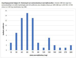 Τα προϊόντα κάνναβης που συνιστώνται στους ασθενείς ήταν κυρίως το έλαιο που εφαρμόστηκε κάτω από την γλώσσα (94,7). Επτά ασθενείς (3,7%) έλαβαν άδεια αγοράς ελαίου και φυτικού υλικού (μπουμπούκια) και τρεις ασθενείς (1,5%) έλαβαν άδεια να αγοράσουν μόνο φυτικό υλικό. Οι περισσότεροι ασθενείς κατανάλωναν έλαιο με 30% CBD και 1,5% THC, κατά μέσο όρο 79,5 ± 61,5mg CBD και 4,0 ± 3,0mg THC, τρεις φορές την ημέρα (για πιο λεπτομερή κατανομή των καταναλώσεων CBD/THC, βλ. Συμπληρωματικό Σχήμα. S1). Με αϋπνία καταγράφηκαν 46 ασθενείς (24,4%) που υποβλήθηκαν σε θεραπεία με βραδινές δόσεις ελαίου THC 3% με κατά μέσο όρο επιπλέον 5,0 ± 4,5mg THC ημερησίως. Όλα τα περιεχόμενα των προϊόντων επικυρώθηκαν με HPLC (High Performance Liquid Chromatography, Υψηλής Απόδοσης Υγρή Χρωματογραφία) σε κάθε κύκλο παραγωγής. Η δόση κάνναβης δεν συσχετίστηκε σημαντικά με το βάρος (συντελεστής συσχέτισης r = 0,13, p = 0,30), την ηλικία (r συντελεστής συσχέτισης = 0,10, p = 0,38) ή το φύλο (p = 0,38).