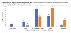 Ποιότητα ζωής. Η ποιότητα ζωής, η διάθεση και η ικανότητα να εκτελούνται καθήκοντα της καθημερινής ζωής αξιολογήθηκαν πριν από τη θεραπεία και σε έξι μήνες. Η καλή ποιότητα ζωής αναφέρθηκε από το 31,3% των ασθενών πριν από την έναρξη της θεραπείας ενώ σε 6 μήνες η καλή ποιότητα ζωής αναφέρθηκε σε 66,8% (p<0,001, Συμπληρωματικό Σχήμα S2). Η θετική διάθεση αναφέρθηκε από τους γονείς σε42% πριν από τη θεραπεία και σε 63,5% μετά από 6 μήνες θεραπείας (p <0,001). Η ικανότητα ανεξάρτητου ντυσίματος και ντους βελτιώθηκε σημαντικά από 26,4% που δεν ανέφερε δυσκολία σε αυτές τις δραστηριότητες πριν από τη θεραπεία σε 42,9% στους έξι μήνες (p <0,001). Παρομοίως, ο καλός ύπνος και η καλή συγκέντρωση αναφέρθηκαν σε 3,3% και 0,0% (αντίστοιχα) πριν από τη θεραπεία και σε 24,7% (p <0,001) και 14,0% (p <0,001) κατά τη διάρκεια της δραστικής θεραπείας (Πίνακας 3).