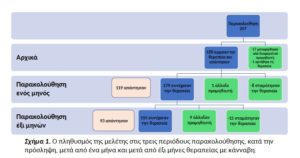 Από τους 23 ασθενείς που διέκοψαν τη θεραπεία, 17 (73,9%) απάντησαν στο ερωτηματολόγιο παρακολούθησης των έξι μηνών. Οι λόγοι για τη διακοπή της θεραπείας ήταν: κανένα θεραπευτικό αποτέλεσμα (70,6%, δώδεκα ασθενείς) και παρενέργειες (29,4%, πέντε ασθενείς). Ωστόσο, το 41,2% (επτά ασθενείς) των ασθενών που διέκοψαν τη θεραπεία είχε αναφέρει την πρόθεση να επιστρέψουν στην θεραπεία.